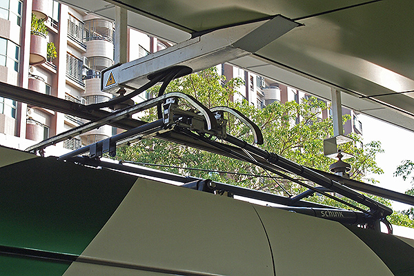 高雄輕軌列車的集電弓是在站內車輛停駐於正確位置才會升起,當列車停