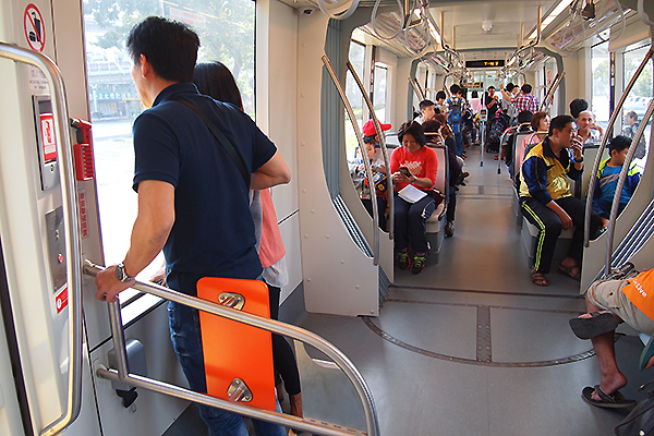 這張圖可看到車內的扶手配置狀況,輕軌列車內部扶手、無論是直桿或者